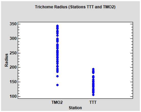 Concerning the analysis of the radius of the trichomes, we initially focused on the Algerian data. The descriptive results for all groups and stations can be observed in Table 7. The differences between the stations TMO2 and TTT seem obvious, but not between groups WS and WD. To test this hypothesis, a three factor ANOVA model was performed: group (WS and WD), station (TMO2 and TTT) and tree, with the last stated as a random factor nested to the interaction between group and station. Group and station are crossed factors, and the interaction term was included in the model. The results are clear: no significant differences between WS and WD (p = 0.4510), significant differences between TMO2 and TTT (p < 0.0001), but no interaction detected (p = 0.1929). As was expected, tree variability is significant (p < 0.0001). The dot-plot (Figure 7) shows the evident differences between the leaves of the two stations. It can be noted that the radius in TMO2 is higher, but also more variable. Due to the homoscedasticity condition of the ANOVA models, we performed separate models for each station (ANOVA nested design, tree nested to the group) No significant differences between groups WS and WD were detected in TMO2 (p = 0.1934) neither in TTT (p = 0.5322), so it seems reasonable that WS and WD can be pooled (group W).