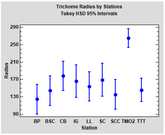 With the aim to compare the trichome radius of TMO2 and TTT with the stations from Catalonia, we reran the last ANOVA design (tree nested to station), this time including the Algerian stations. When we added TTT into the analysis, the result showed no significant differences between stations (p = 0.1296). Finally, we reran the analysis, adding TTT and TMO2;a significant difference among stations was detected this time (p < 0.0001). As could be expected, post hoc pairwise comparisons (Tukey HSD method, α = 5%) revealed that solely TMO2 is significantly different from the others (TTT and the seven Catalonian stations). Tukey HSD confidence intervals for each station are plotted in Figure 8.