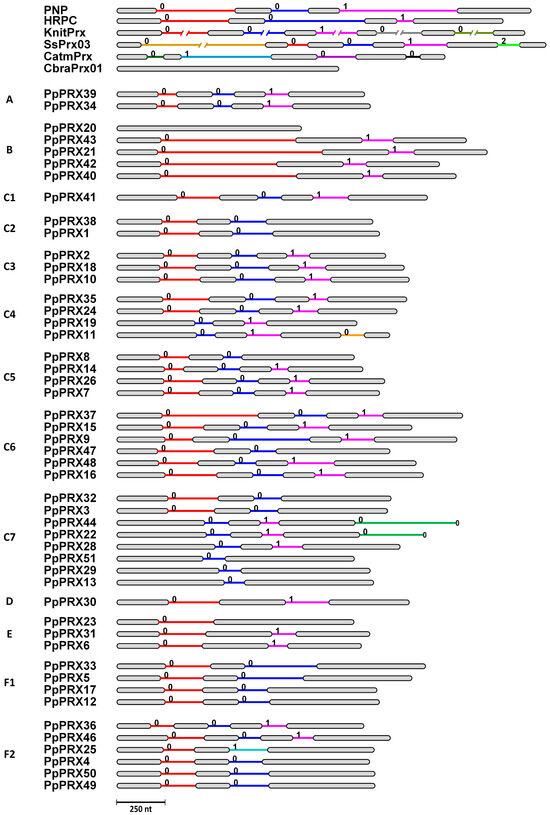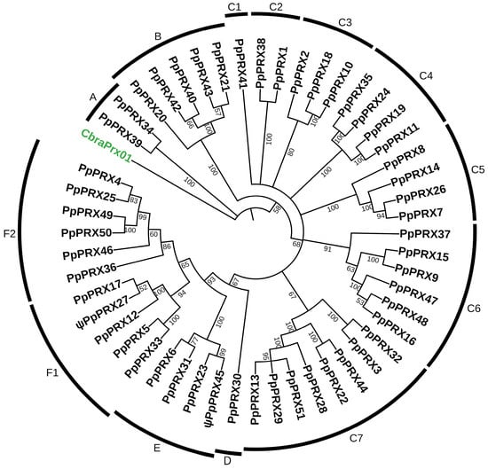 The rooted ML tree of PpPRX sequences comprised seven major clades, A to F, and clades C and F were further divided into multiple subclades (Figure 1). Except for the singleton clade C1 (PpPRX41), all nodes were supported by bootstrap values higher than 50%. The seven major clades were hierarchical: clade A of PpPRX34 and PpPRX39 was sister to the rest of the family, while clade B was sister to clades C–F. Clade D consisted of a single gene, PRX30, sister to clades E and F.