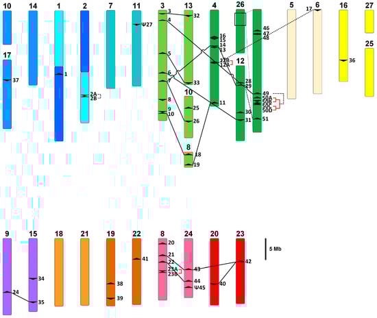 P. patens PRX sequences collated in Lehtonen et al. [31] and in RedoxiBase (https://peroxibase.toulouse.inra.fr (accessed on 8 March 2023)) [32] were used for tBLASTn searches of the P. patens v3.3 genome in Phytozome 13 (https://phytozome-next.jgi.doe.gov (accessed on 8 March 2023)). Protein sequences of the candidate genes were further analyzed for the conserved amino acid residues [5] and named from PpPRX1 to PpPRX51 according to their chromosomal locations.