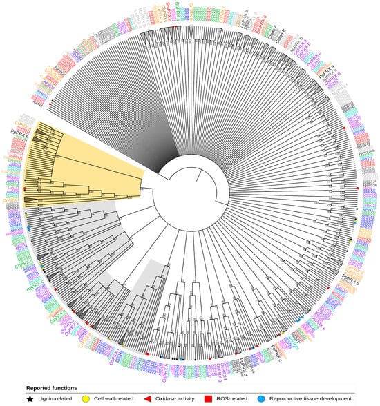 An ML tree of all PpPRXs and PRXs selected from eight model plants, each representing a major embryophyte lineage, was also reconstructed to find any embryophyte-spanning clades. Amino acid sequences of PRXs from Anthoceros punctatus, Marchantia polymorpha, Selaginella moellendorffii, Ginkgo biloba, Amborella trichopoda, Oryza sativa, and Arabidopsis thaliana were retrieved from RedoxiBase, and Ceratopteris richardii PRX sequences were obtained from Phytozome 13. Thirty-two non-redundant PRXs with reported functions (Table S1) were added to give a total of 855 PRXs (Table S2). APX1, an ascorbate peroxidase from Arabidopsis, was added to root the tree. The sequences were aligned in MAFFT and trimmed in AliView. An ML tree was reconstructed using the RAxML-HPC BlackBox tool in the CIPRES Gateway [37]. The WAG substitution model with the shape parameter of the gamma distribution, a proportion of invariable sites, and empirical amino acid frequencies was used (WAG + G + I + F). The number of discrete gamma categories was set to 4. Support for the tree was measured using bootstopping and clades with <50% support were collapsed into polytomies. Additionally, large algal or single-species clades were collapsed in iTOL and represented by black triangles.