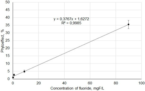 Eluate phytotesting was carried out by analogy with the standard protocol MP 2.1.7.2297-07 “Justification of the hazard class of production and consumption waste by phytotoxicity” [41]. Different concentrations of sodium fluoride solution were tested, containing 0.09, 0.9, 9 and 90 mgF/L, dissolving the NaF salt in distilled water and subsequently diluting the resulting solutions tenfold. Distilled water served as a control. Paper filters “Blue Ribbon” were placed in Petri dishes, moistened with five milliliters of the tested solutions and 25 seeds were added to each dish. The experiment was carried out in triplicate. After seven days, the root length of each seedling was determined. A conclusion about the phytotoxic effect of fluoride solutions was made based on the calculation of the phytoeffect—if the root length was reduced by 20% or more, the phytotoxic effect was considered proven.