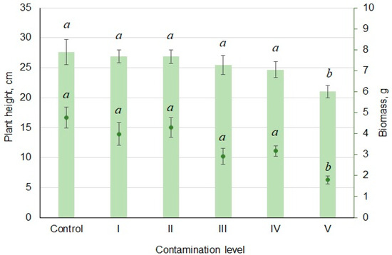 Height and aboveground biomass of plants. Letters above the columns indicate reliable presence (letters are different), absence of differences (letters are the same) between experimental variants at p < 0.05.
