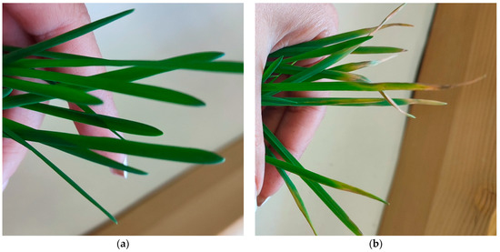 The appearance of the shoots grown in the control soil and in sample V—soil with a water-soluble fluorine content of 238.9 mgF⸱kg−1—was noteworthy (Figure 3). Chlorosis usually begins at the leaf edges and spreads between the veins to the base of the leaf [54,55]. In this regard, it was of interest to evaluate the change in the chlorophyll level in plants. The indicators determined using a portable minispectrometer are presented in Table 2.