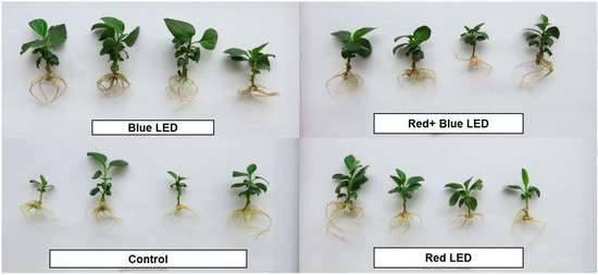 Similarly, Lin et al. [35] demonstrated that fluorescent lamps and red LEDs were less efficient than blue LEDs, resulting in lower shoot formation and dry mass in Dendrobium officinale explants cultivated in vitro. Liu et al. [55] also observed that Platycodon grandiflorum seedlings exhibited greater increases in dry mass under blue LEDs compared to red LEDs.