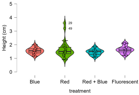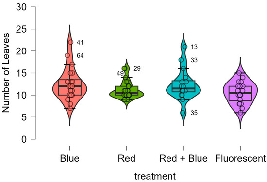 The number of leaves obtained using LED treatments was comparable to that obtained using the control (Figure 7). The Shapiro–Wilk test indicated that the data were not normally distributed (p-value = 0.001), and the Bartlett’s test revealed unequal variances (p-value = 0.012). However, the Kruskal–Wallis test demonstrated that the four treatments yielded equivalent results (p-value < 0.213).