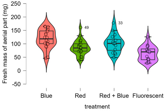 Seedlings exposed to LEDs exhibited notably higher fresh mass in the aerial parts compared to those under the control (fluorescent lamp) (Figure 3). The Shapiro–Wilk test confirmed that the data were normally distributed (p = 0.600), and the Bartlett’s test indicated equivalent variances (p = 0.904). The one-way ANOVA revealed significant differences in fresh mass among the four treatments (p < 0.001).