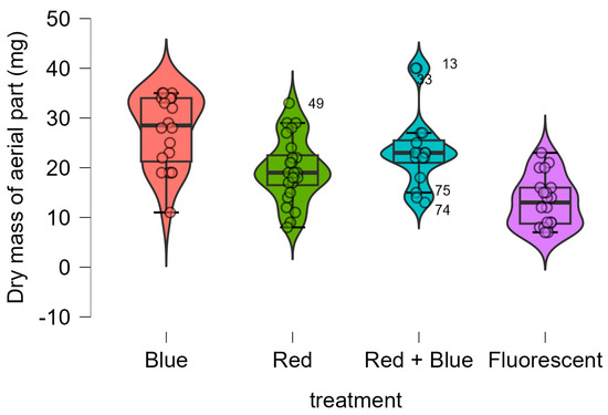 The dry mass of the aerial parts was significantly higher in seedlings treated with LEDs compared to those under the control treatment (fluorescent lamp) (Figure 4). The Shapiro–Wilk test confirmed that the data followed a normal distribution (p = 0.615), and the Bartlett’s test indicated homogeneity of variances (p = 0.432). The one-way ANOVA identified significant differences in dry mass among the four treatments (p < 0.001).