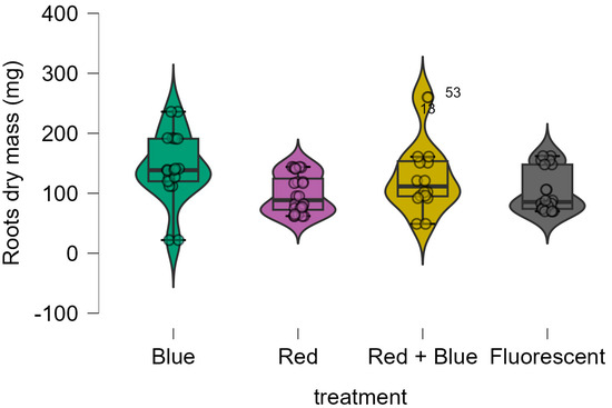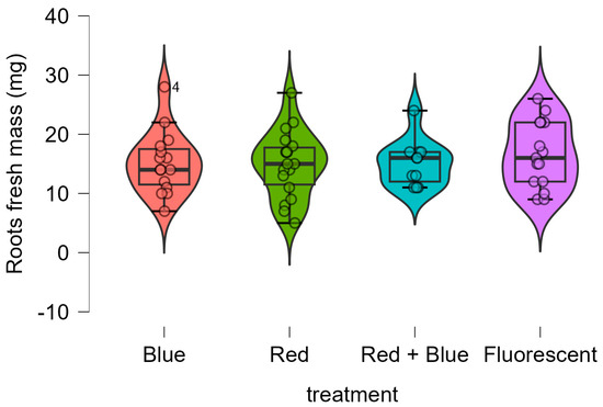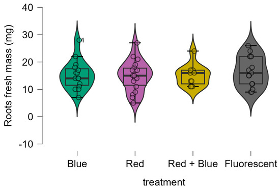 The fresh mass of roots obtained under LED treatments was comparable to that obtained with the control (fluorescent lamp) (Figure 6). The Shapiro–Wilk test confirmed the normality of the data (p-value = 0.501), and Bartlett’s test indicated homogeneity of variances (p-value = 0.629). One-way ANOVA further revealed that there were no significant differences in root fresh mass among the four treatments (p-value = 0.835).