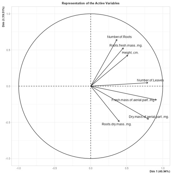 A principal component analysis (PCA) was performed on the normalized data to identify patterns in vegetative growth [60,61]. The score plot (Figure 9) was used to observe correlations and trends within the data [44,62,63,64]. It illustrates that the number of roots, root fresh mass, and plant height were positively correlated, with samples located in the top-right quadrant exhibiting higher values for these parameters. Similarly, the fresh mass of aerial parts, dry mass of aerial parts, and root dry mass were correlated, with samples positioned in the bottom-left quadrant showing higher values for these variables.