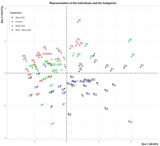 The loading plot (Figure 10) highlights that Marubakaido apple rootstock samples with greater vegetative growth were primarily situated on the right side of the plot. Most of these samples were grown under blue LED light, indicating that this light source promoted the best vegetative growth. In contrast, samples with less vegetative growth were predominantly located on the left side of the plot, corresponding to control samples grown under fluorescent lamps. These findings demonstrate that LED lights, particularly blue LEDs, were more effective than fluorescent lamps in enhancing vegetative growth.