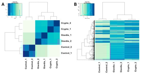 For DESeq, we set the significance at p < 0.05 and fold difference at −1 > log2 > 1. Exposure to Giardia resulted in 2469 upregulated and 1767 downregulated genes (see the entire list in Supplementary File S1). Exposure to Cryptosporidium upregulated 3052 and downregulated 2609 genes (see the entire list in Supplementary File S2). Figure 1B shows the heat map and dendrogram of the top 1000 DEGs, demonstrating complete separation of samples.