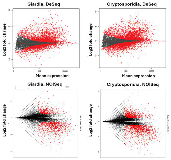 For NOISeq, the significance was based on the probability test (see Methods) and the probability value of >0.95, and the fold difference at −1 > log2 > 1. Exposure to Giardia resulted in 1675 upregulated and 714 downregulated genes (see the entire list in Supplementary File S3). Exposure to Cryptosporidia resulted in 2207 genes upregulated and 1263 genes downregulated (see the entire list in Supplementary File S4). Heat map with cluster analysis shows the overall lower number of DEGs in the NOISeq test, likely due to more stringent conditions applied by this type of analysis. DEGs were visualized using Volcano plots (Figure 2).