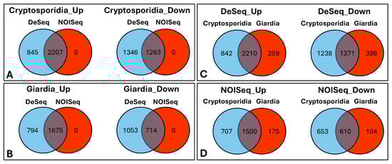 Overlap between DEGs. (A). Overlap between DEGs found by DESeq and NOISeq methods for Cryptosporidia. (B). Overlap between DEGs found by DESeq and NOISeq methods for Giardia. (C). Overlap between DEGs in Cryptosporidia and Giardia found using DESeq method. (D). Overlap between DEGs in Cryptosporidia and Giardia found using NOISeq method.