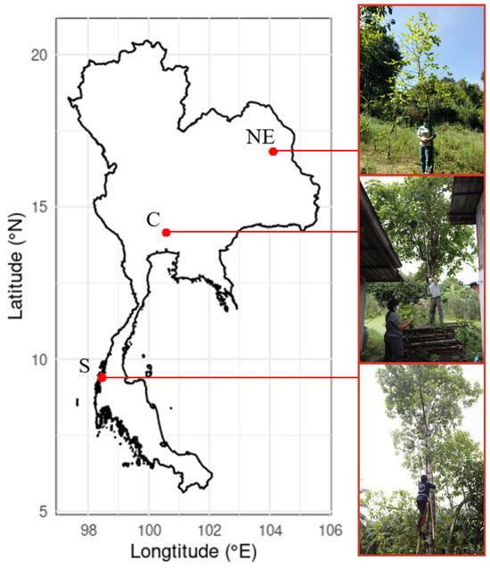 Locations of the kratom trees sampled from the southern (S), central (C), and northeastern (NE) regions of Thailand.