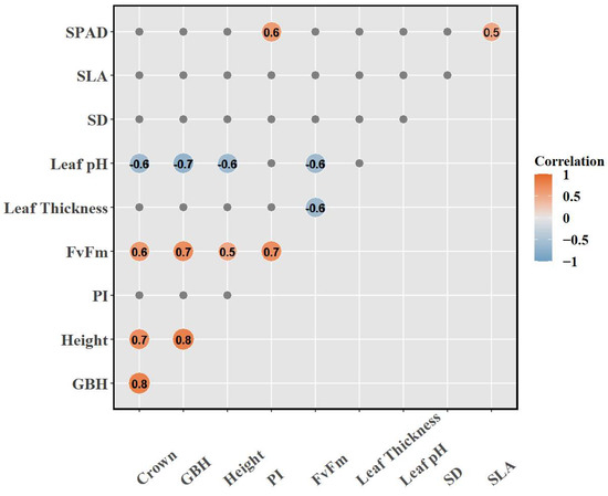 Correlation matrix of growth parameters (crown area [Crown], girth at breast height [GBH], and height) with physiological traits (performance index [PI], quantum yield [Fv/Fm], leaf thickness, leaf pH, stomatal density [SD], and specific leaf area [SLA]) in kratom. Only significant correlations (p-value < 0.05) are shown in colored circles, with red indicating positive correlations and blue indicating negative correlations. Numbers in circles represent correlation values ranging from −1 to 1.