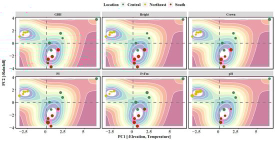 Contour plots of significant air and soil variables (Figure 5) indicate that the NE region was characterized by higher elevations and lower light intensity, whereas the C and S regions were mainly at elevations below 50 m receiving higher light intensity, exceeding 18 MJ m−2 day−1. Being situated at higher elevations, locations in the NE had lower temperatures and VW, whereas the C and S regions had higher average temperatures and VW, indicating generally warmer and wetter conditions. Most trees in the C and S regions were positioned along gradients of decreasing elevation and increasing light, temperature, and VW, exhibiting higher Fv/Fm and PI values. In contrast, trees located in the NE followed the opposite pattern. This suggests that the sampled locations in the C and S regions were generally located at lower elevations, receiving a higher light intensity, greater soil water availability, and warmer conditions compared to the NE. These findings further highlight the role of environmental and soil variables in shaping the observed trait variations across the three regions.