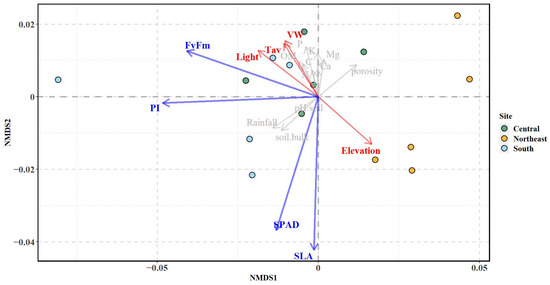NMDS ordination triplot with significant plant traits (blue vectors), environmental and soil variables (red vectors), and sampled locations (filled circles). The gray vectors indicate insignificant environmental and soil variables.