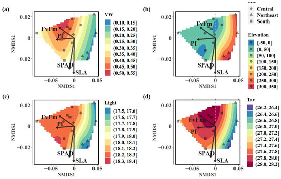 NMDS plots showing elevation gradients as contour overlays on sampled sites, represented by various shapes for C, NE, and S. Darker colors represent higher values of respective soil and environmental variables: (a) volumetric water content (VW), (b) elevation (Elevation), (c) light intensity (Light), and (d) average temperature (Tav). Vectors represent plant traits significantly associated with air and soil variables.