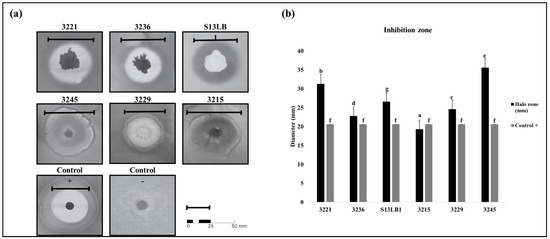 Comparative analysis of antagonistic strains against Allorhizobium vitis S4. (a) Zones of inhibition (halos) resulting from a disk diffusion test. (b) Inhibition zones triggered by antagonistic isolates. Treatment groups are indicated on the x-axis. The different letters (a, b, c, d, e, f, gindicate statistically significant differences between groups as determined by Tukey’s test (p < 0.05).