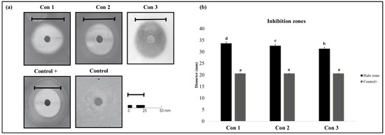 Inhibition zones resulting from the direct confrontation between microbial consortia and A. vitis. (a) Zones of inhibition (halos) resulting from a disk diffusion test. (b) Inhibition zones triggered by selected consortia. Treatment groups are indicated on the x-axis. The different letters (a, b, c, d) indicate statistically significant differences between groups as determined by Tukey’s test (p < 0.05). Con 1: 3221–3236, Con 2: 3221-S13LB1, and Con 3: 3236-S13LB1.