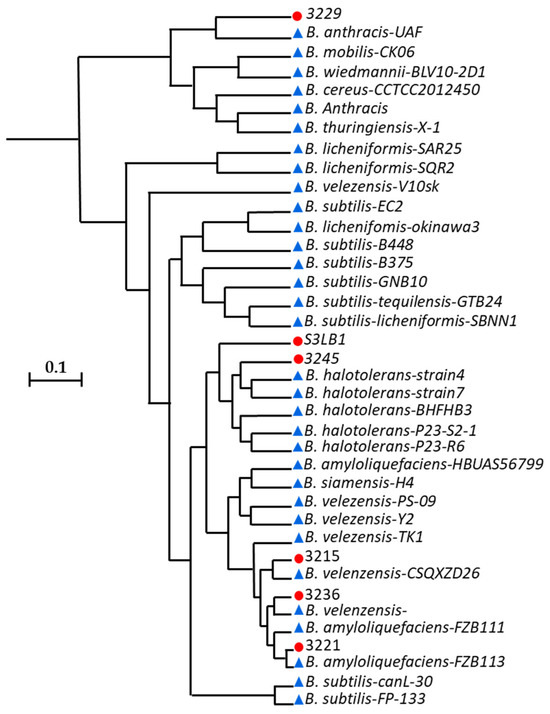 Initial trees for the heuristic search were obtained automatically by applying Neighbour-Join and BioNJ algorithms to a matrix of pairwise distances estimated using the Maximum Composite Likelihood (MCL) approach and then selecting the topology with superior log likelihood value. This analysis involved 39 nucleotide sequences. Evolutionary analyses were conducted in MEGA X (Figure 4). In this study, we performed a detailed phylogenetic analysis to determine the genetic proximity of several Bacillus strains, highlighted by red dots on the phylogenetic tree. Strain S13LB1 is closely related to B. subtilis-B375, indicating a recent divergence from their common ancestor. Similarly, strain 3245 is genetically close to B. halotolerans-strain4, while strain 3215 is closely related to B. velezensis-Y2. Furthermore, strain 3236 is closely related to B. velezensis-ZLP, and strain 3221 is closely related to B. amyloliquefaciens-FZB111 and -FZB113. However, strain 3229 shows a close genetic relationship with B. anthracis-UAF (Figure 4).
