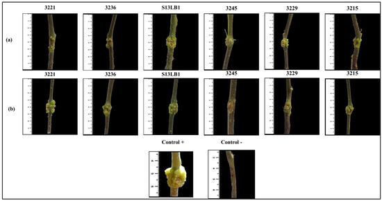 Crown gall disease is one of the most difficult diseases to treat with chemicals and physiological techniques. Employing resistant plant cultivars and antagonistic microbial species seems to be an effective method to reduce crown gall disease because different defensive response pathways are engaged in the early stages of infection, depending on the plant resistance [49]. Numerous laboratories have reportedly tried to biologically control crown gall disease [50,51,52]. These biocontrol agents provide adaptability and metabolic diversity, broadening the plant’s capacity to overcome environmental changes and cope with challenging conditions [53,54]. In particular, the rhizosphere communities are a subset of the more complex soil microbiota [55]. Endophytic bacteria spend their life within the plant tissues without leading to the development of any disease, and they produce a wide range of volatile organic compounds with antimicrobial activity [56]. In earlier studies, endophytic bacteria were isolated from healthy domesticated and wild grapevines. Some of these bacteria demonstrated the ability to inhibit the crown gall pathogen both in vitro and in vivo [57,58]. In the present study, these strains were isolated and screened for their antagonistic activity against Allorhizobium vitis and assessed via in vitro and in planta bioassays to identify the best-adapted microorganisms to manage crown gall in grapevine.