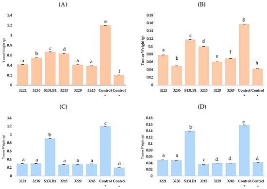 Fresh and dry tumour weight in preventive and simultaneous treatment conditions of plants with the six strains (3221, 3215, 3245, 3229, S13LB1). (A): weight of fresh tumours in preventive treatment conditions; (B): weight of dry tumours in preventive treatment conditions; (C): weight of fresh tumours in simultaneous treatment conditions; (D): weight of dry tumours in simultaneous treatment conditions. Treatment groups are indicated on the x-axis. The different letters (a, b, c, d, e, f, g, h) indicate statistically significant differences between groups as determined by Tukey’s test (p < 0.05).