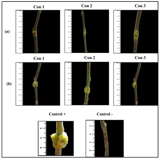 In this study on the biocontrol of Allorhizobium vitis using microbial consortia, the efficacy of three consortia (Con 1, Con 2, and Con 3) was tested on the indicator plant tomato (Figure 7).