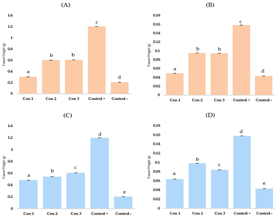 Fresh and dry tumour weight in preventive and simultaneous treatments of plants with three strain mixtures (Con 1: 3221–3236, Con 2: 3221-S13LB1, and Con 3: 3236-S13LB1). (A): weight of fresh tumours in the simultaneous conditions (B): weight of dry tumours in the simultaneous conditions; (C): weight of fresh tumours in the preventive conditions; (D): weight of dry tumours in the preventive condition. Treatment groups are indicated on the x-axis. The different letters (a, b, c, d, e) indicate statistically significant differences between groups as determined by Tukey’s test (p < 0.05).