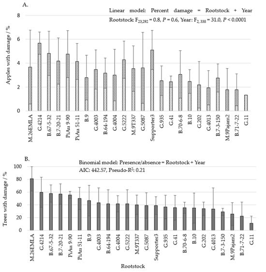 Initial observation of differences across rootstock was observed at harvest, where damage from H. testudinea in the ‘Honeycrisp’ planting was noted in 2013, 2014, and 2017. Linear analysis disclosed that primary damage, resulting from the larvae burrowing into the developing fruitlet but failing to develop further, showed large variation within rootstocks with strong differences between years (Figure 1A). Negative binomial analysis using the presence/absence of damage disclosed the best model to be the additive model (Figure 1B). Year was significant in these models, with both 2014 and 2017 being significantly different from 2013 (p = 0.04 and <0.0001, 2014 and 2017, respectively), with rootstock also being significant (p = 0.01). Rootstocks from the same breeding programme, e.g., ‘Malling’ (M26.EMLA, M9.T337 and M9.Pajam2), did not group together for either damage or percentage of trees showing damage from H. testudinea.