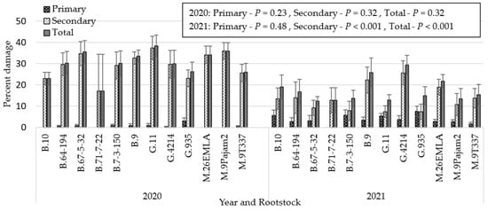 Mean (± SE) of fruitlets showing primary, secondary, and total damage from Hoplocampa testudinea in a bagging study occurring in ‘Honeycrisp’ planting located at Kentville Research and Development Centre, Nova Scotia, in 2020 and 2021. Primary, secondary and total damage significant between years, p < 0.001.