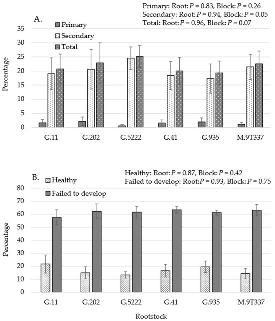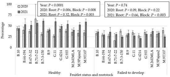 Larval performance, evaluated using a bagging study, disclosed no significant differences across rootstocks for fruitlets with primary (larvae did not survive, F11,18 = 1.4, p = 0.23), secondary (larvae survived and moved to next fruitlet, F11,18 = 1.2, p = 0.32), or total damage (sum of primary and secondary, F11,18 = 1.2, p = 0.32) from H. testudinea in 2020 (Figure 2). Damage in 2020 was significantly higher than in 2021 for these same damage categories (year—primary: F1,77 = 34.4, p < 0.0001; secondary: F1,77 = 71.1, p < 0.0001; total: F1,77 = 45.6, p < 0.0001). Secondary and total damage was significant across rootstock in 2021 (F11,19 = 2.6, p < 0.0001, F11,19 = 2.0, p < 0.0001, secondary and total, respectively). Post hoc lsmeans test disclosed G.11 to have significantly less secondary and total damage than B.9 (p = 0.04) and G.4214 (p = 0.04). Similar to oviposition preference, some rootstocks showed a similar level of damage across both years, e.g., G.4214 and B.9, while others showed more serious impact in 2020 and very little in 2021, e.g., G.11, M.9Pajam2, and B.67-5-32. Total damage from H. testudinea was predominantly secondary damage, i.e., 88–100% and 49–100% of the total damage, in 2020 and 2021, respectively. In terms of fruitlets developing through to the undamaged fruit stage, this varied by year (F1,77 = 24.5, p < 0.0001) and rootstock (F1,77 = 7.1, p < 0.0001); see Figure 3. Healthy fruit in 2020 varied across rootstock and block (F1,18 = 3.7, p = 0.006, F3,18 = 5.3, p = 0.008, rootstock and block, respectively), likely driven by an interaction between these two factors (F28,18 = 2.5, p = 0.01). No significant difference across rootstock was observed in 2021 (F11,19 = 1.2, p = 0.3). The percentage of fruitlets which failed to develop remained consistent across years (F1,77 = 0.1, p = 0.7) and rootstock (F11,77 = 0.5, p = 0.8), ranging from 16 to 39% in 2020 and 21 to 38% in 2021.