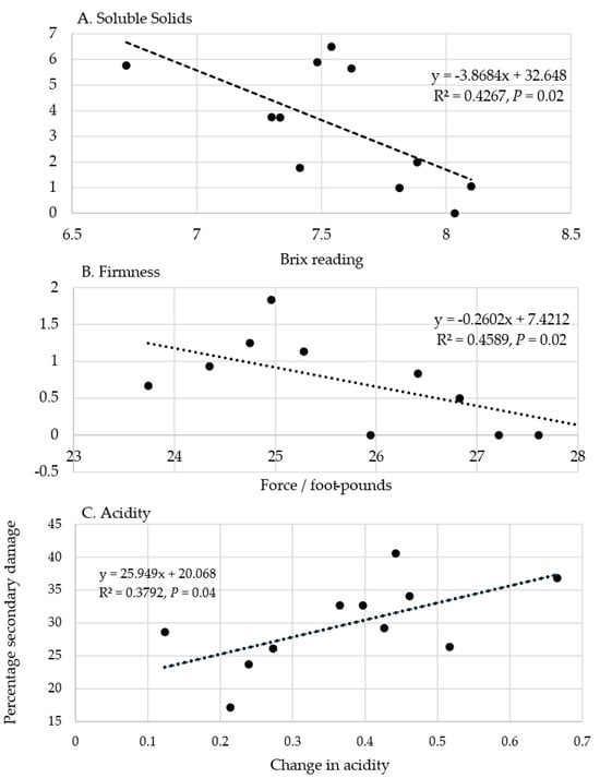 Fruitlet physicochemical traits showed significant differences across rootstock for soluble solids when fruitlets were 20–25 mm (F10,15 = 3.3, p < 0.01) and 30–35 mm (F10,15 = 11.8, p < 0.0001) in diameter; see Table 3. Acidity and firmness when fruitlets were 20–25 mm or 30–35 mm diameter size showed no significant differences across rootstock (p > 0.05). Linear regression of these traits (averaged within the rootstock) against primary (Table 4) or secondary (Table 5) damage disclosed a few significant relationships. Primary damage, indicative of larval failure and occurring early in fruitlet development, showed a negative relationship with soluble solids in 2021 (p = 0.02) when fruitlets were small (20–25 mm) and in 2020 (p = 0.01) when fruitlets were more developed (30–35 mm). Primary damage was significantly and positively correlated with changes in soluble solids in 2021 (p = 0.02), but negatively correlated with firmness when fruitlets were 30–35 mm in size (p = 0.02). The only significant relationship between fruitlet physicochemical variables and secondary damage was observed in 2020, where a change in acidity was positively correlated with damage (p = 0.04); see Table 5. Average values within rootstock of soluble solids were measured in 2021 when fruitlets were 20–25 mm in diameter and regressed against primary damage observed in 2022; the relationship was significant (F1,9 = 6.6, p = 0.02; Figure 4A). Primary damage was negatively related with firmness when fruitlets were 30–35 mm (F1,9 = 7.6, p = 0.02); see Figure 4B. For secondary damage, indicative of larval success, a positive change in acidity as fruitlets developed was significant (F1,9 = 5.4, p = 0.04); see Figure 4C.