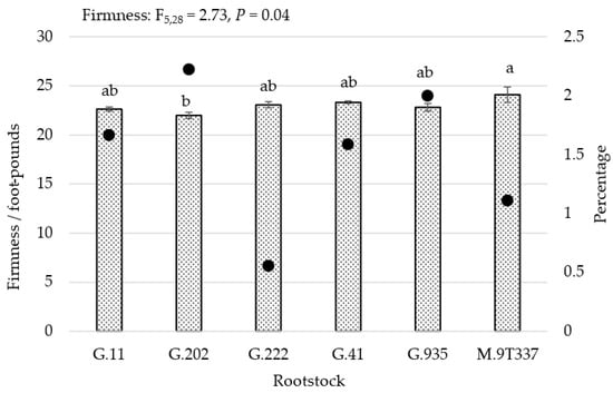 Mean (±SE) firmness of fruitlets at 20–25 mm (bars) with percentage primary damage (dots) from Hoplocampa testudinea across 6 rootstocks with a Modi® scion located at Kentville Research and Development Centre, Nova Scotia. Letters above bars denote significant differences across rootstocks for firmness.