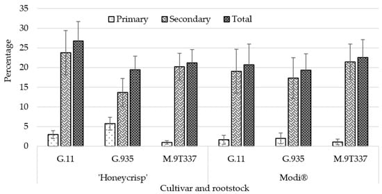 Mean (±SE) fruit with primary, secondary, and total damage from Hoplocampa testudinea on 3 rootstocks from ‘Honeycrisp’ and Modi® plantings located at Kentville Research and Development Centre, Nova Scotia.