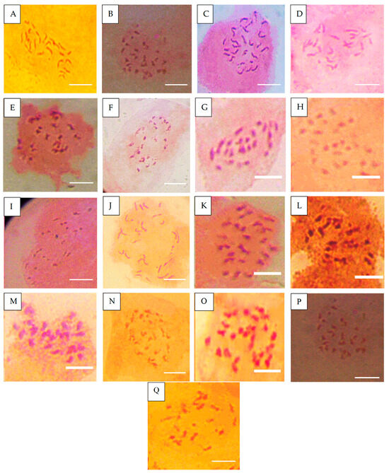 69], was not observed in certain accessions and the control that showed tolerance, which retained the standard diploid chromosome number of 2n = 2x = 24. The discrepancies between the current study and previous findings can likely be attributed to differences in experimental treatments and conditions. However, the presence of the diploid chromosome number in