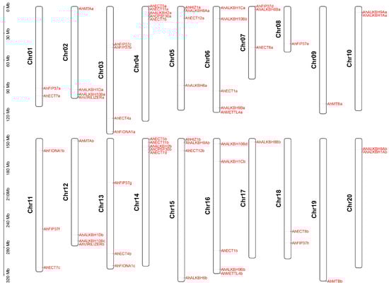 The protein sequences of all members of writers and erasers responsible for m6A modification in Arabidopsis were obtained from the TAIR website (https://www.arabidopsis.org; accessed on 20 October 2024). The genome data of Arachis hypogaea cv. Tifrunner, a runner-type peanut (registration number CV-93, PI 644011) [16], was downloaded from https://www.peanutbase.org (20 October 2024).