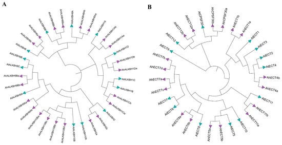 Phylogenetic tree of the peanut m6A gene. The phylogenetic tree of m6A genes were constructed using maximum likelihood (ML). (A) Phylogenetic tree was constructed based on the protein sequences of 22 eraser genes; (B) phylogenetic tree was constructed based on the protein sequences of 19 reader genes.