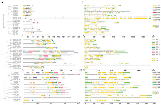 Gene structure and conserved domains of the peanut m6A gene. (A) The distribution of ten conserved motifs in the m6A gene was analyzed by MEME. Different colors represent different patterns and positions; (B) analysis of the gene structure of the m6A gene. The yellow rectangle represents the exon, the light green rectangle represents the UTR, and the gray line connecting the two exons represents the intron.