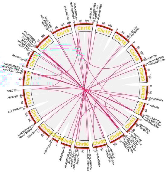 Collinearity analysis of the peanut m6A gene. The red lines represent the presence of collinearity between genes.