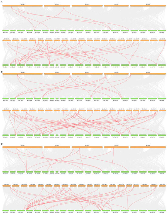 Collinearity of the m6A gene among peanut, Arabidopsis thaliana and soybean. (A), Collinearity analysis of the writer gene. (B) Collinearity analysis of the eraser gene. (C) Collinearity analysis of the reader gene. The gray line represents the collinearity between all members, and the red line represents the collinearity between members of the m6A gene family.