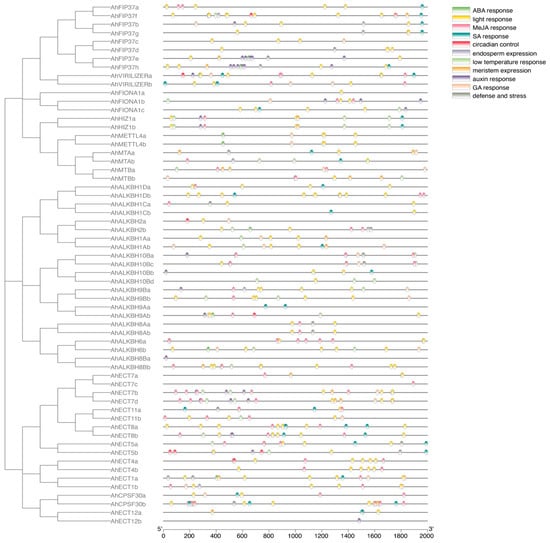 Promoter element analysis of the peanut m6A gene. Different cis-regulatory elements in the promoter are denoted by square bars of different colors.