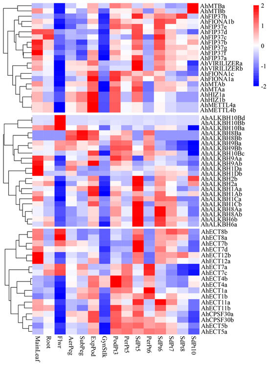 The heatmap presented the expression pattern of m6A genes in 15 tissues in peanut. The utilizing row-wise normalization with Z-scores based on previously published RNA-seq data. Main leaf, main stem leaf; Root, roots of 10 days postemergence; Flwr, petals, keel, and hypanthium sepals; AerPeg, elongating aerial pegs; Subpeg, elongating subterranean pegs; ExpPod, Pattee 1 pod; GynStlk, Pattee 1 stalk of gynophore; PodPt3, Pattee 3 pod; PerPt5, Pattee 5 pericarp; SdPt5, Pattee 5 seed; PerPt6, Pattee 6 pericarp; SdPt6, Pattee 6 seed; SdPt7, Pattee 7 seed; SdPt8, Pattee 8 seed; SdPt10, Pattee 10 seed [26].