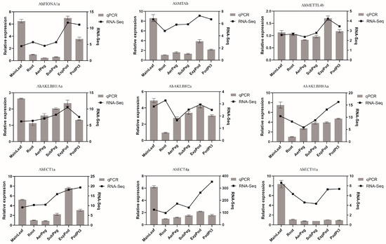 To determine the expression of peanut m6A members in different tissues. Transcriptome analysis was performed on 15 tissues of peanut. The results showed that there were similar expression patterns among homologous genes. The expression level of the m6A gene was lower at the flower and GynStlk stages. More than half of the m6A-regulated genes among the writer and reader regulated genes were consistently highly expressed in different tissues of peanut seedlings, with only a few moderately or lowly expressed (Figure 8). This indicates that peanut needs to maintain its m6A modification level during growth and development. Writer members AhFIONA1a and AhMETTL4b were highly expressed at the ExpPod stage of pod expansion (Figure 9). At the same time, we found that eraser genes showed obvious tissue specificity. It is worth noting that AhALKBH8Ba and AhALKBH8Bb are almost not expressed in leaves, flowers, roots and peanut pods. However, the expression levels of AerPeg, Subpeg, ExpPod, GynStlk and PodPt3, PerPt5, PerPt6 were higher in the process of peanut needle penetration. Reader member AhECT1a was highly expressed in ExpPod and PodPt3 (Figure 8 and Figure 9). Correlation analysis showed that there was a positive correlation between the expression of writer genes. AhALKBH10Bb, AhALKBH10Bd, AhALKBH8Ba, AhALKBH8Ba were negatively correlated with the expression of other eraser genes. The expression of AhECT8a and AhECT8b in reader genes was negatively correlated with AhECT1a, AhECT1b, AhECT4a and AhECT4b. There was a positive correlation between gene expression in different tissue sites (Figure S5). The different expression patterns of these genes reflect the complexity of regulatory genes in peanut growth. The potential biological function of the m6A gene was explored by analyzing its specific expression in different tissues of peanut.
