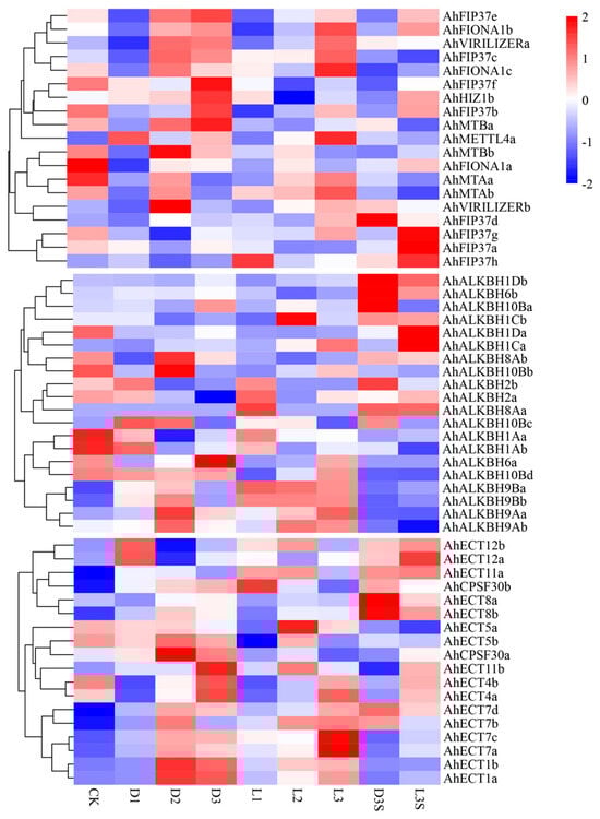 Expression of members of the peanut m6A gene under light and mechanical stress. The utilizing row-wise normalization with Z-scores based on previously published RNA-seq data. Peanut pods were immediately wrapped in air-permeable black paper bags to simulate the loss of mechanical stress alone, and D samples collected after 58 h of treatment (day 3) were designated D3. The pods were exposed to air for 58 h (day 3) to simulate darkness and loss of mechanical stress and were designated as sample L3. Two biological replicates were performed for each sample.