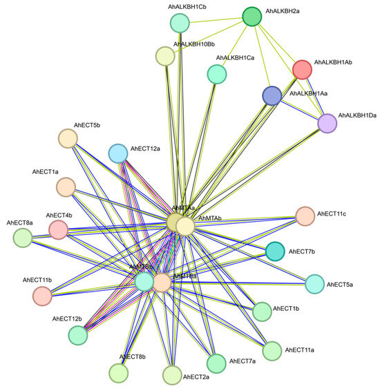 In order to explore the protein–protein interactions between m6A proteins and other proteins, we used STRING database to construct the protein–protein interaction network. The network consists of 26 nodes and 84 protein interactions, with average node degree of 6.46 and a value of 0.478 for avg. local clustering coefficient. Most of the genes in the protein–protein interaction network are m6A genes. These include 4 writer genes, 7 eraser genes and 15 reader genes. AhMTAa, AhMTAb, AhMTBa, AhMTBb, AhECT12a and AhECT12b genes have more interactive proteins. In addition, most of the reader genes can interact with AhMTAa, AhMTAb, AhMTBa, and AhMTBb proteins. AhALKBH1Aa, AhALKBH1Ab, AhALKBH1Ca, AhALKBH1Cb, AhALKBH1Da, and AhALKBH10Bb proteins can interact with AhMTAa, AhMTAb proteins (Figure 11).