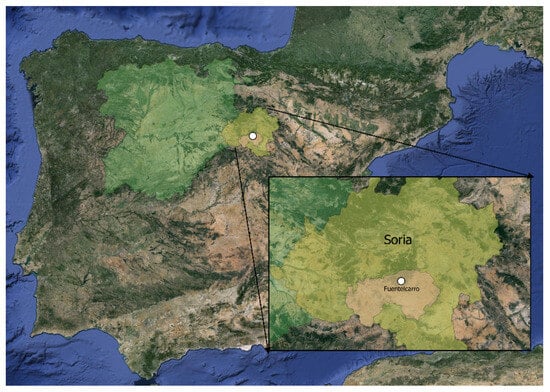 Small branches of J. communis were collected from its natural habitat in Fuentelcarro (Soria), as shown in Figure 1. The site is situated at an altitude of 1024 m. The local climate has an average annual temperature of 9.7 °C and annual rainfall of 440 mm, based on 20-year averages (CEDER meteorological station). The soil texture is sandy loam with acidic pH.