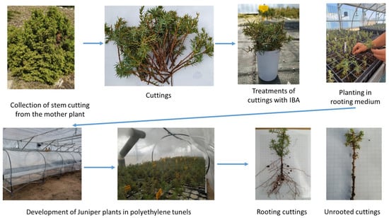 Difficulties in rooting of cutting in coniferous species have been reported [,,] and their vegetative propagation has not been sufficiently developed [,,] despite this being the method normally used for the commercial propagation of Juniperus species [,]. In relation to J. communis studies have been carried out [,,,,], but further investigation is necessary.