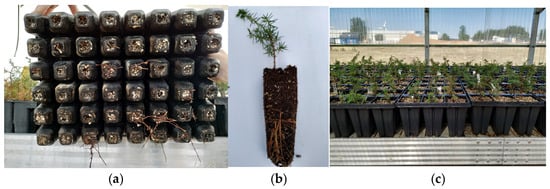 Transferring rooted cuttings to six cells per pack. (a) Cuttings growing in RM in polyethylene forest trays with 48 cells per pack. (b) Rooted cuttings. (c) Cuttings growing in professional substrate in polyethylene forest trays with six cells per pack.